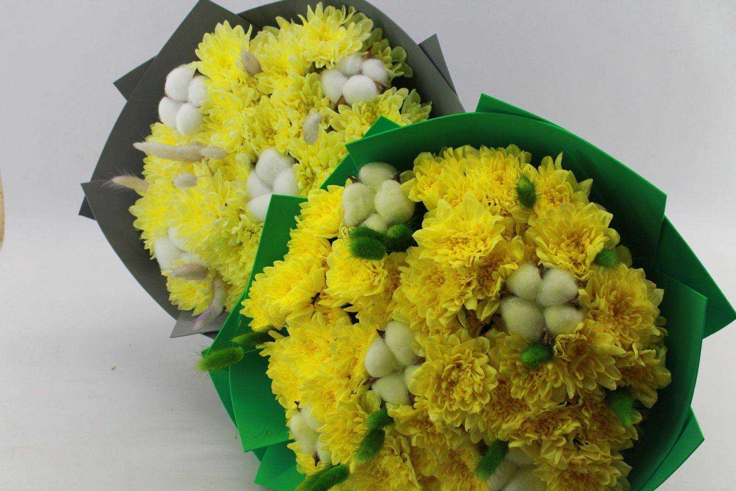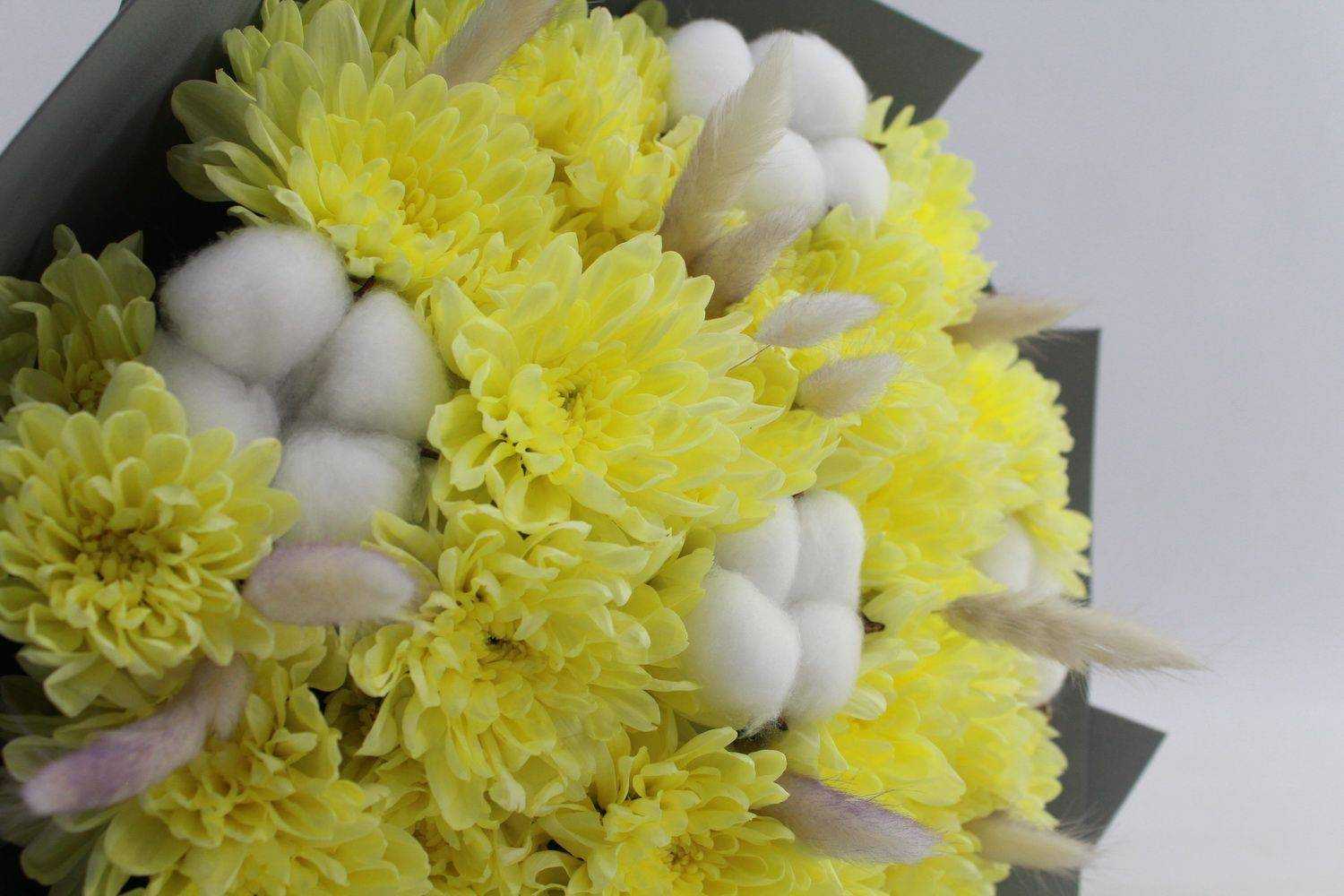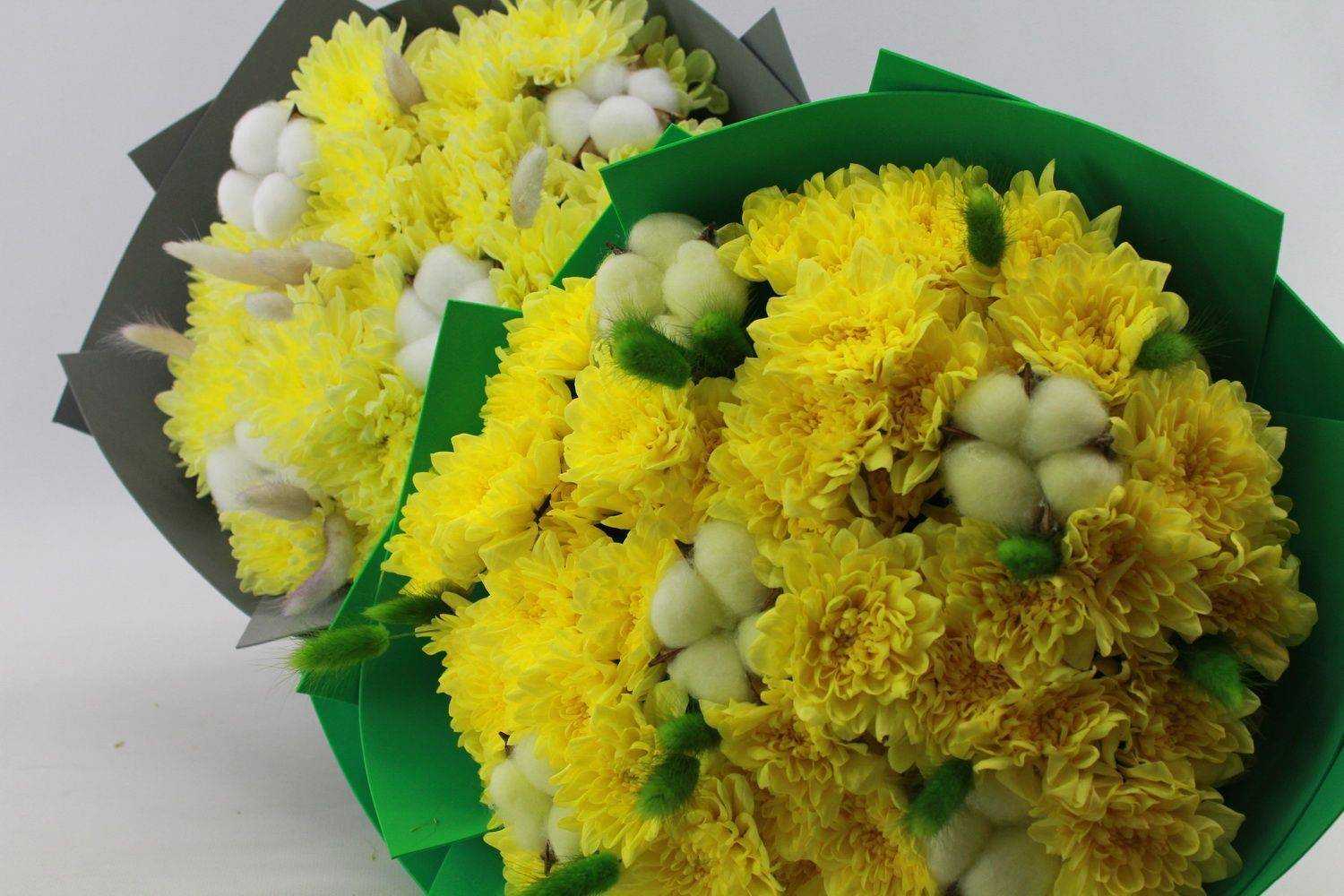 Данный букет представлен на фото в двух цветах: ванильный и желтый.